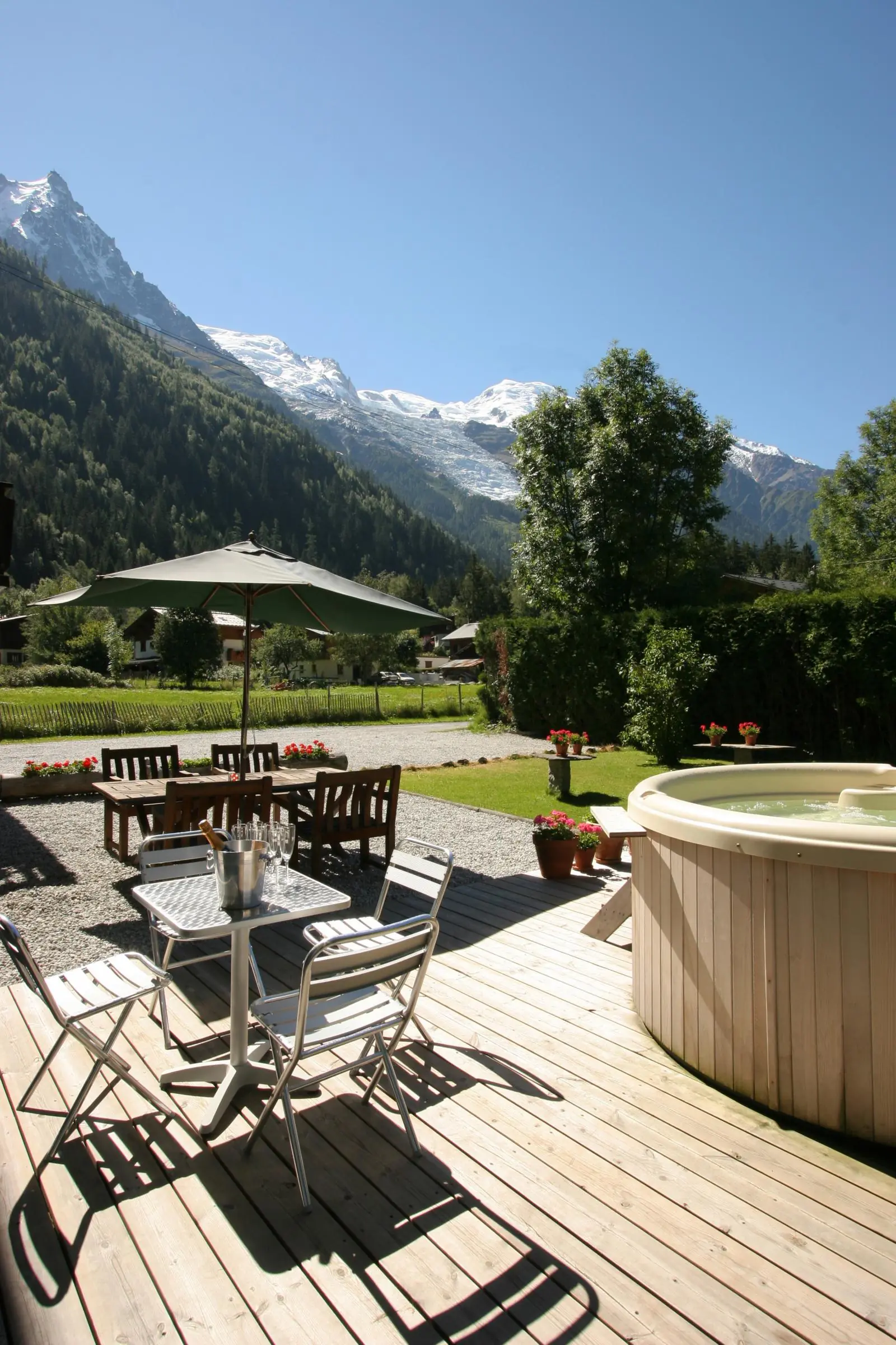 The comfortable and modern chalet has en suite rooms throughout and a pleasant open plan lounge with south facing panoramic windows and balcony overlooking Mont Blanc. Surrounded by a private garden with Jacuzzi and just 15 minutes walk into Chamonix, Chalet Chamonix is the perfect base for walking the best of the Tour du Mont Blanc and a relaxing week in the Alps. 2 bedrooms on the top floor have Velux windows set into a gradually sloping roof. Half the room has a full height ceiling while the beds are positioned under the sloping section. Please note: these two rooms will be allocated to the last 4 people to book. Single rooms are not available.