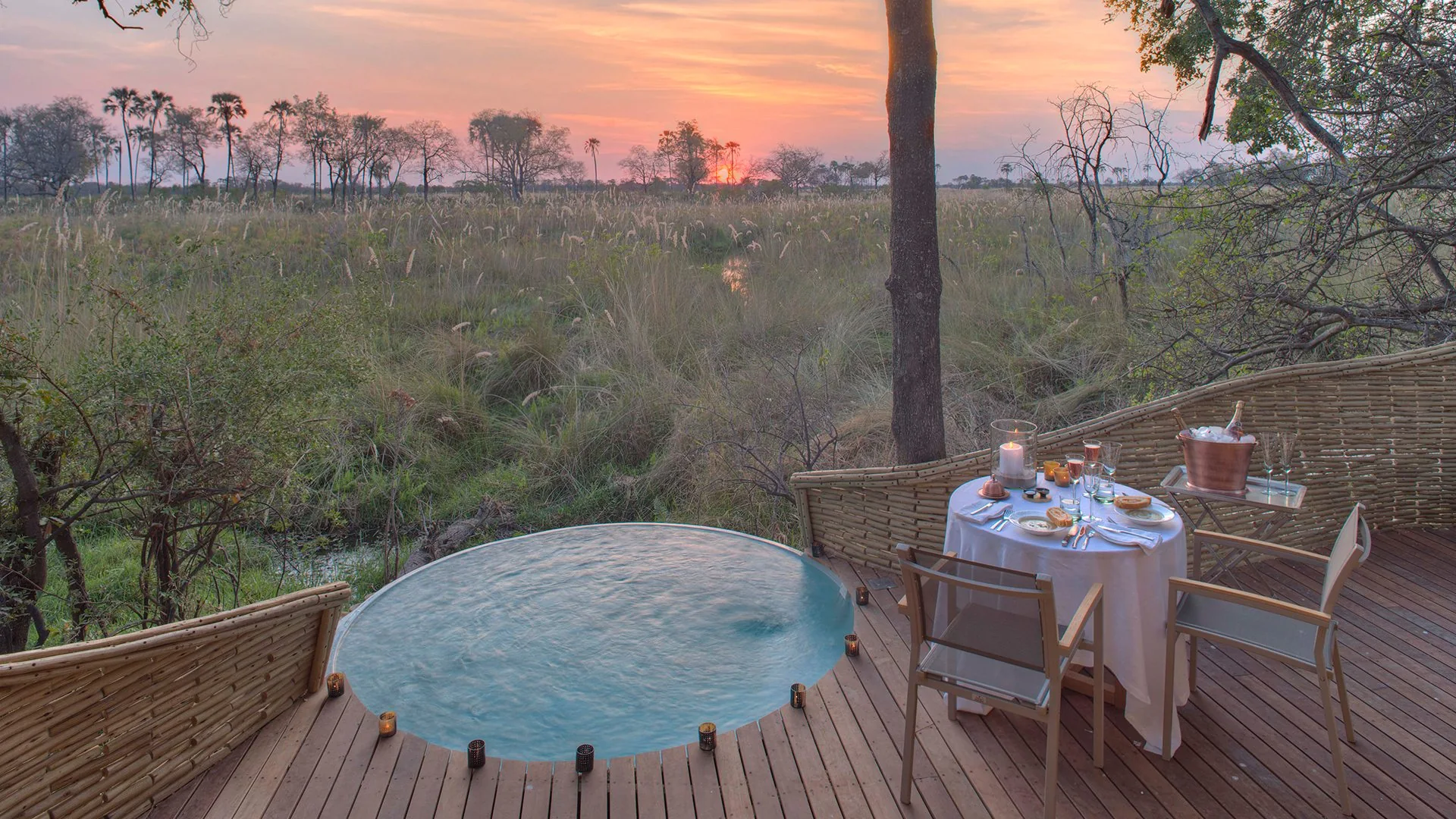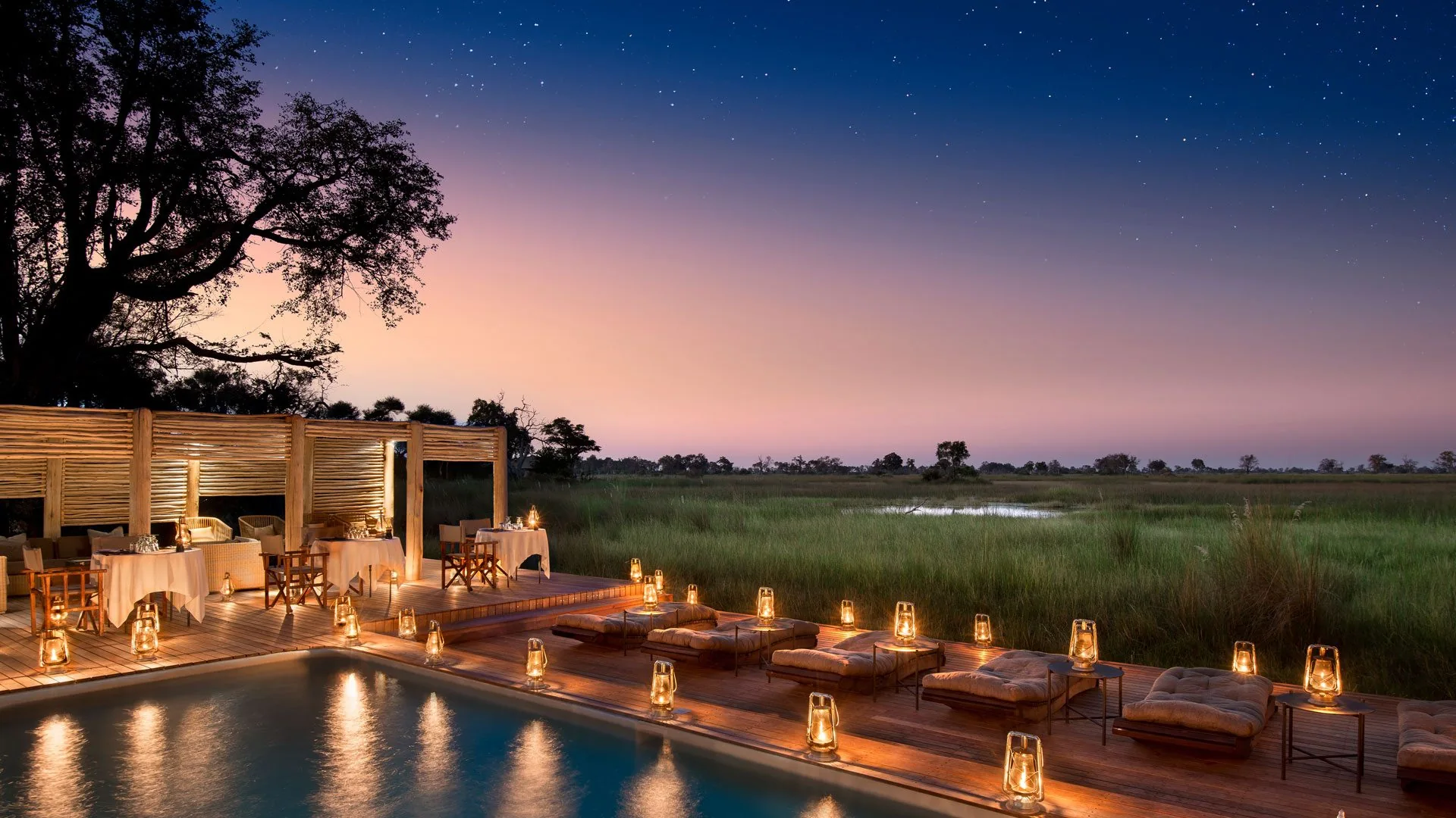 Dig your bare toes into the golden sand, cooled by the clear Delta waters, fishing rod or ice-cold drink in hand. Peer into the savage jaws of the tiger fish or marvel at the dazzling colours of the lilac-breasted roller. End the day admiring the multi-coloured spectacle of the African sunset.